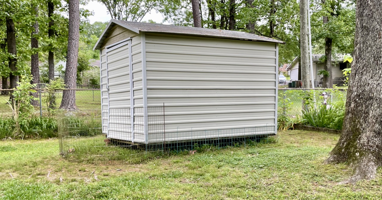 It’s one of those modular sheds, and set up on concrete blocks. Lots of people around here have them, and plenty of wild critters learn to hide or nest in the crawl space. Even the wrens take their fledglings there as a way station after they first leave the nest.