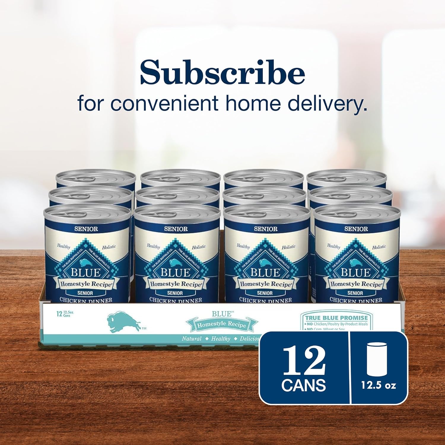 Contains: Twelve (12) 12.5-oz cans of BLUE Homestyle Recipe Natural Senior Wet Dog Food, Chicken Dinner with Garden Vegetables