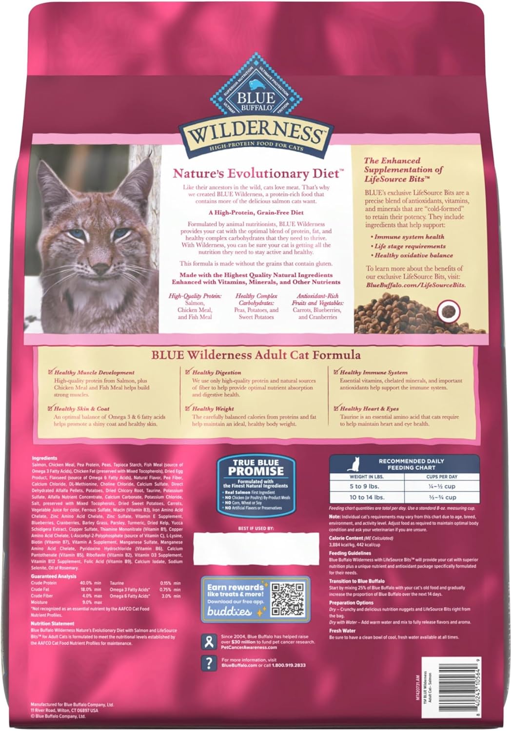 Contains: One (1) 11-lb bag of BLUE High-Protein and Grain-Free Wilderness Natural Adult Dry Cat Food, Salmon Recipe