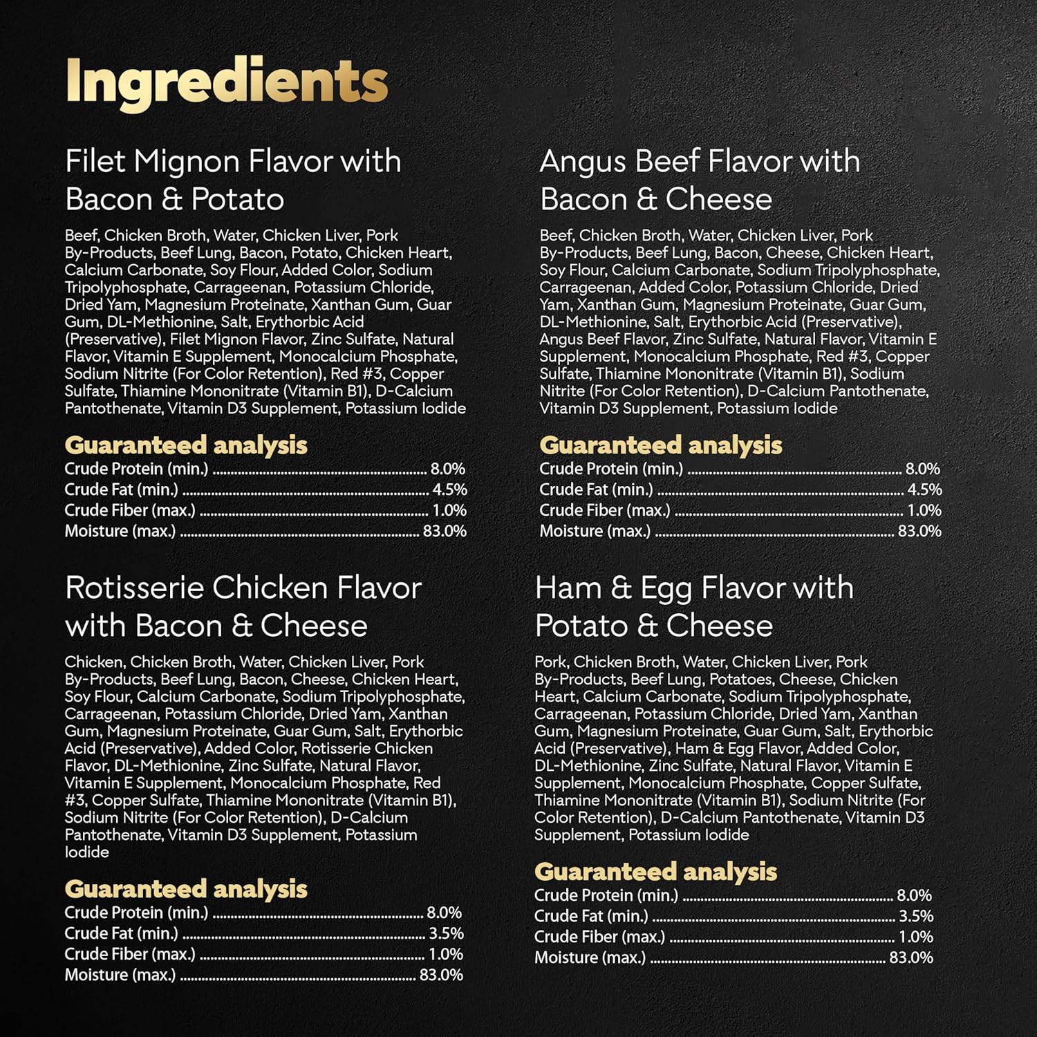 The Cesar brand shows that the best way to share love is by keeping pets happy and healthy with gourmet meals. With real beef as the #1 ingredient, Cesar Loaf & Topper in Sauce Rotisserie Chicken, Filet Mignon, Angus Beef, and Ham & Egg Flavors Variety Pack delivers high-quality protein and is slow-cooked for great taste. This dog wet food is easy to digest, yet hard to resist. Made in the USA with the finest ingredients from around the world, the soft dog food provides a 100% complete and balanced meal for adult dogs. There are no fillers, added sugar, or artificial flavors; ingredients remain natural as defined by the Association of American Feed Control Officials (AAFCO). These convenient trays also function as dog food toppers for dry food or can stand alone for a delicious culinary experience, supporting daily feeding routines for pet owners interested in dog nutrition. Each easy peel-away seal offers a gourmet soft texture that complements any dry kibble and can act as single-serve wet dog food that provides convenience. Enjoy delicious and healthy meals every day with Cesar Loaf & Topper in Sauce Rotisserie Chicken, Filet Mignon, Angus Beef, and Ham & Egg Flavors.