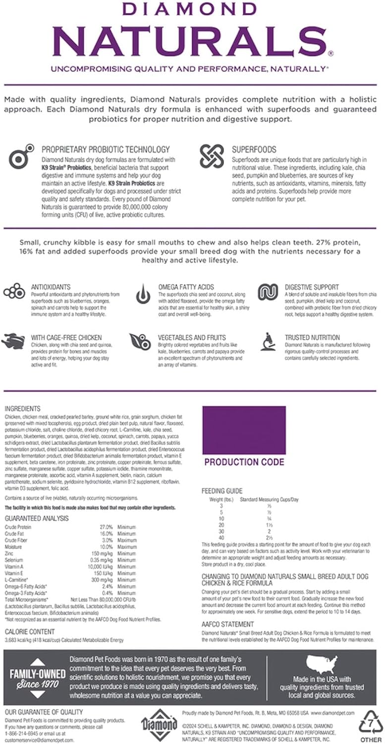 Diamond Naturals Small Breed Adult Dog Chicken and Rice dry dog food; REAL CAGE-FREE CHICKEN is the #1 ingredient; small kibble size and specially formulated to support the needs of SMALL BREED DOGS