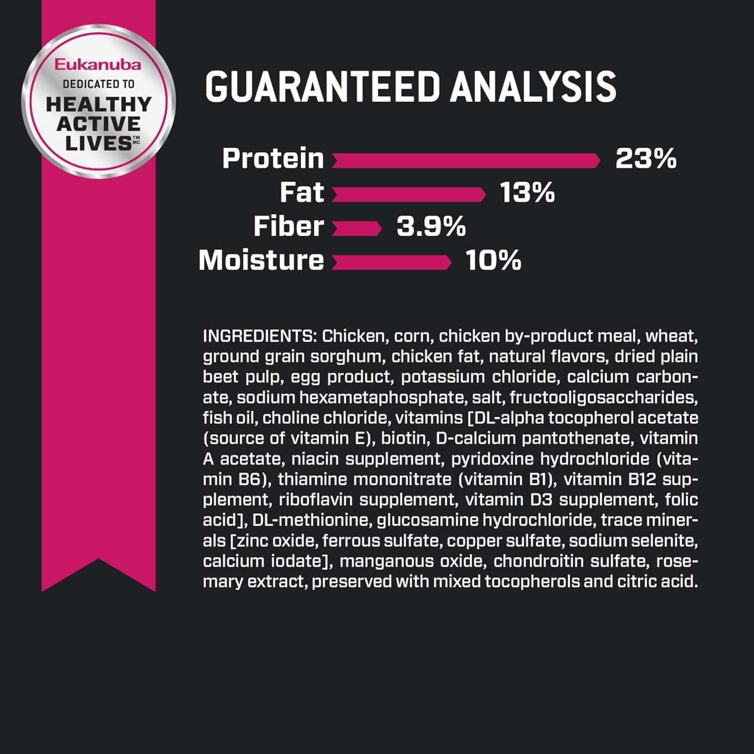 Your large breed dog is anything but ordinary, and can benefit from extraordinary nutrition to help them perform their best. Fuel your lively companion’s body, mind, and energy with Eukanuba(TM) Adult Large Breed Dog Food Dry Formula. Animal protein, glucosamine, and chondroitin sulfate support lean muscles and agile joints. DHA and vitamin E help support healthy brain function. Optimal levels of fats and carbohydrates in this healthy dog food help fuel an active lifestyle. The crunchy texture, S-shaped kibble and a polyphosphate in the 3D DentaDefense reduce tartar buildup for clean teeth and healthy gums. A prebiotic blend with natural fiber for dogs aids gentle digestion to help keep your large breed dog healthy. Plus, high-quality chicken is the first ingredient in this adult dog food to power your big dog’s day. Pair this kibble with Eukanuba Adult Wet Dog Food for the perfect complement. Your dog helps make your life extraordinary. Return the favor by feeding them Eukanuba and fuel the extraordinary in every day, satisfaction guaranteed.