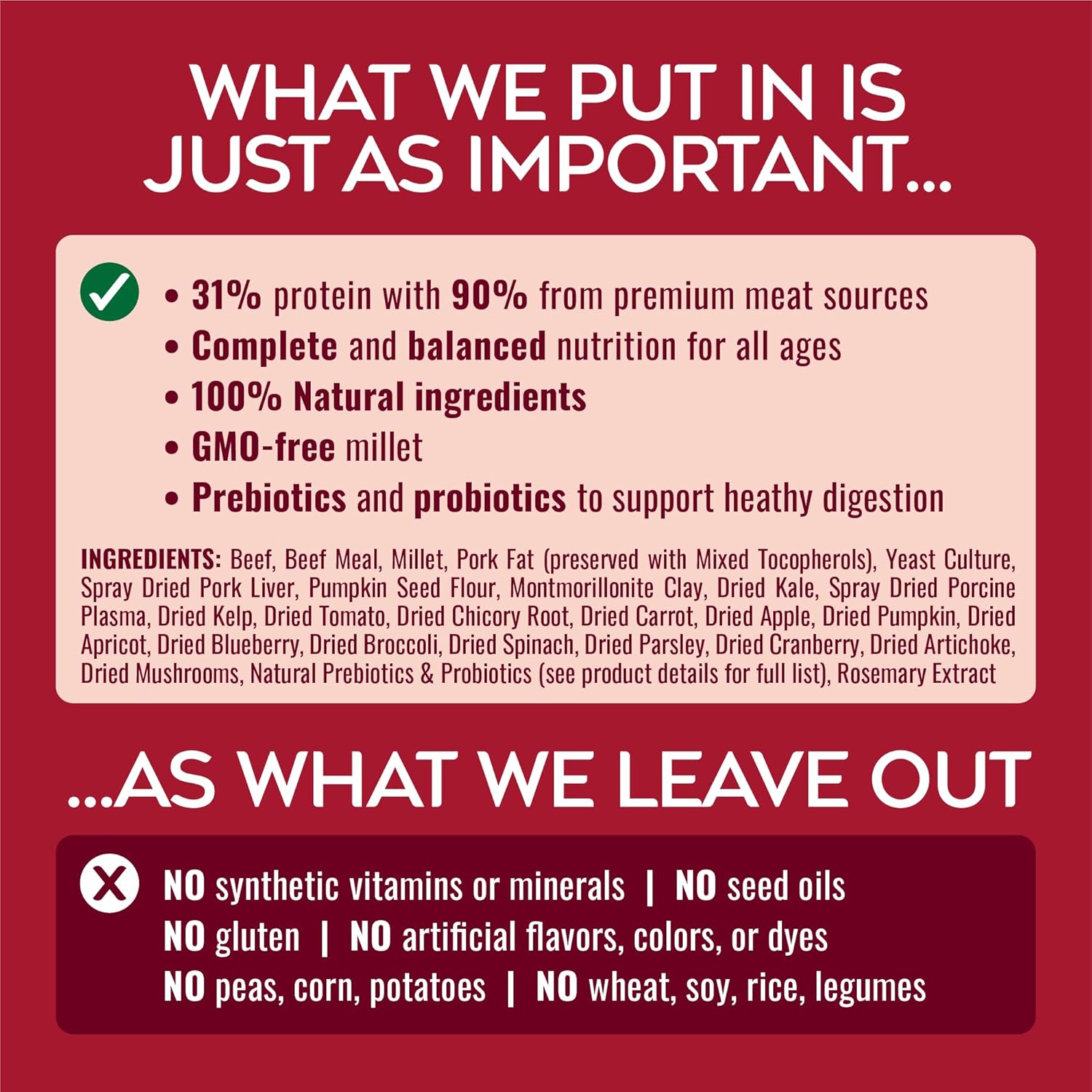 Truly 100% Natural Dog Food – All nutrients come from real food ingredients that come from Earth – no synthetic vitamins or minerals, no artificial flavors, colors, dyes or additives, ever.
