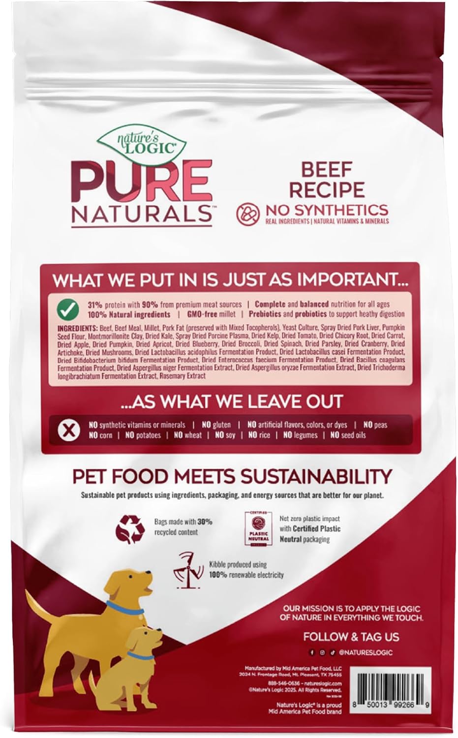 Give your dog a diet that’s as close to nature as it gets. Nature’s Logic PURE NATURALS™ Beef Recipe starts with real beef as the first ingredient and delivers 90% of its protein from premium animal sources – fueling strong muscles, energy, and a taste dogs love. Every bite is truly 100% natural, with all vitamins and minerals coming from real food ingredients, instead of using synthetic nutrients, flavors or additives, delivering a natural nutrition your dog’s body can recognize and absorb. This complete and balanced recipe is perfect for puppies, adults, and seniors of all breeds. It’s naturally gluten-free and made without common fillers like corn, wheat, soy, peas, lentils, potatoes, or seed oils, making it gentle on sensitive stomachs. Plus, it’s chicken-free and rich in natural taurine, prebiotics, and probiotics for heart health, digestion, and immune support. Nature’s Logic kibble is crafted using 100% renewable electricity, and every bag is made with 30% recycled materials.
