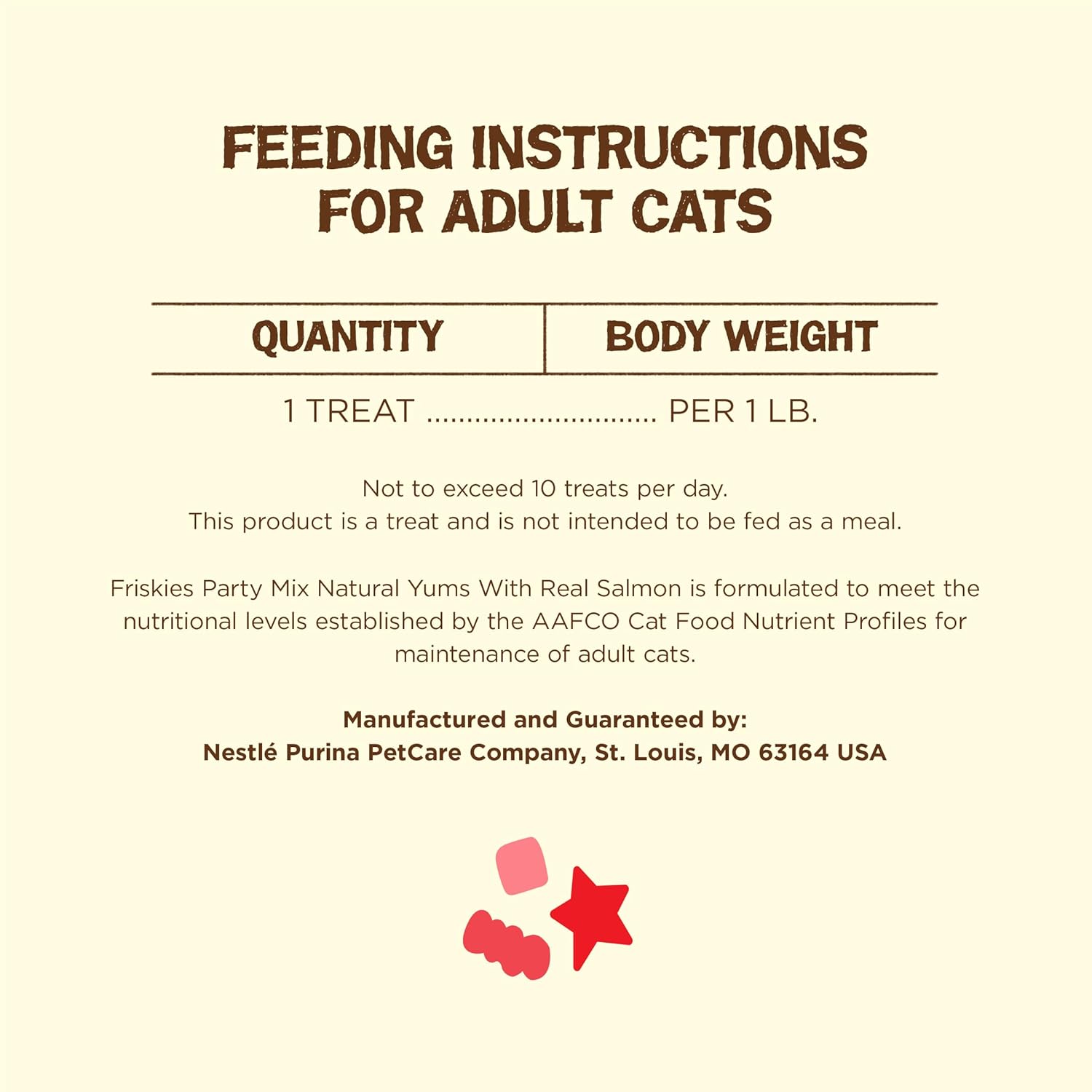 Celebrate your special relationship when you offer your cat Purina Friskies Party Mix Natural Yums Salmon With Added Vitamins & Minerals adult cat treats. Made with real fish as the #1 ingredient, these wholesome treats for adult cats give your feline friend the mouthwatering seafood flavor she craves. These tasty treats are the purr-fect way to pamper your kitty because they contain 100 percent complete and balanced nutrition for adult cats. Keep her happy between meals with one or two treats, or dole out a few pieces along with her dinner to show your love. Fun shapes hold her attention as she crunches away at these yummy treats, which are made without artificial colors, flavors or preservatives. Tear open a pouch of Purina Friskies Party Mix Natural Yums With Real Salmon With Added Vitamins & Minerals adult cat treats to delight your precious pet with tasty flavor and high-quality ingredients.