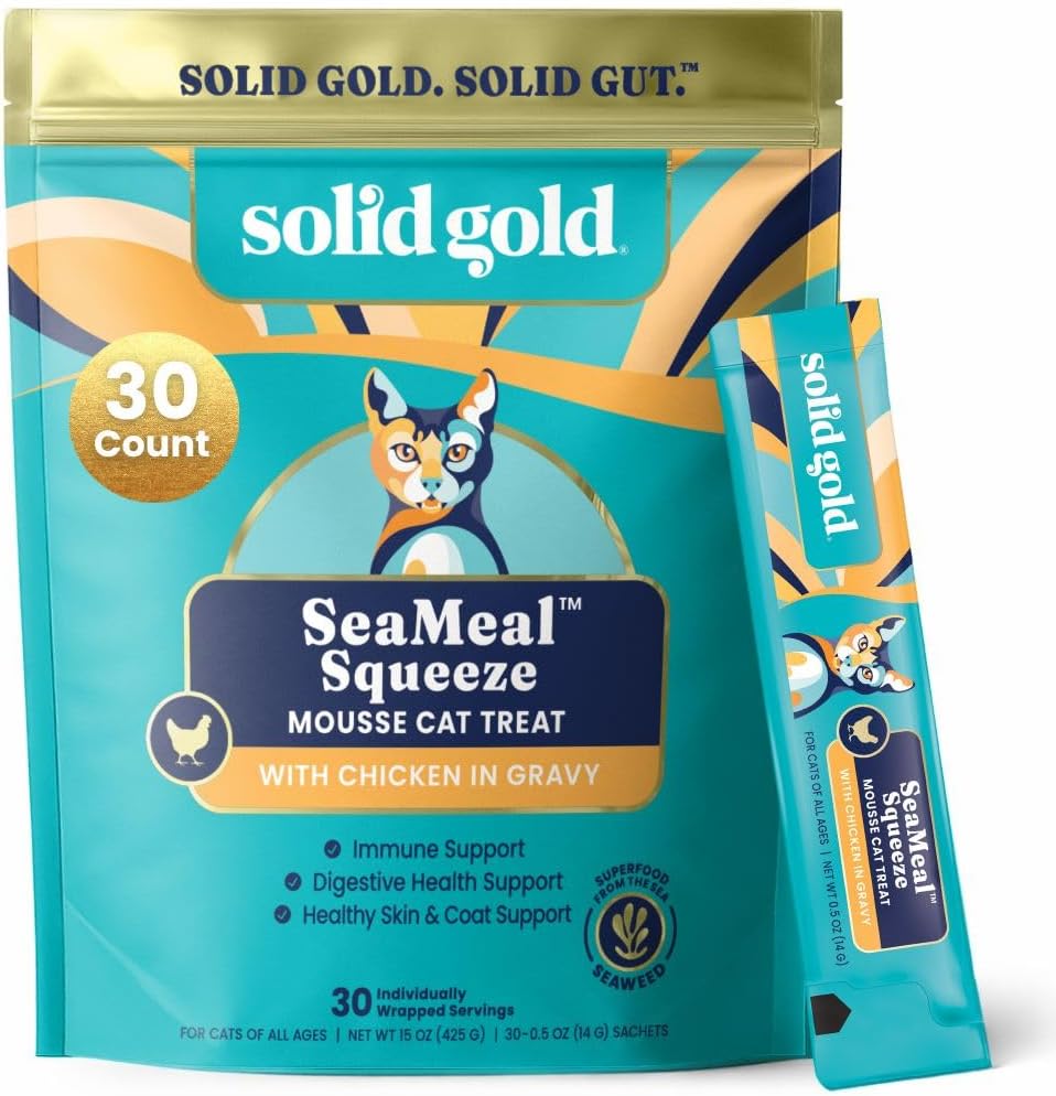 Solid Gold Lickable Cat Treats – Limited Ingredient Chicken SeaMeal™ Squeezable Healthy Cat Treats for Indoor Cats – Snack & Topper Squeeze Ups for Cats w/Seaweed for Gut & Immune Support – 3oz/30ct